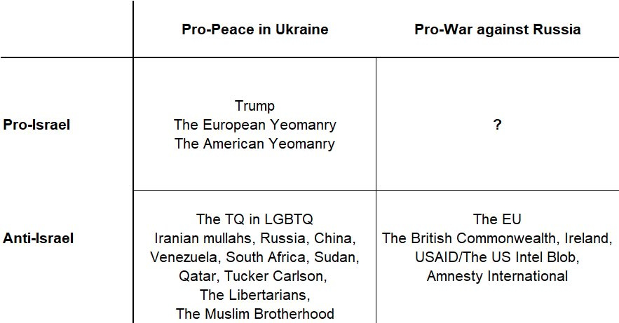 Note that “Pro-Israel” might as well be “Pro-America” or “Pro-Western Civilization,” even with all the “globo-homo” stuff thrown in. “Anti-Israel” would conform to “Anti-America,” “Never-Trump,” and “Anti-Western Civilization.”