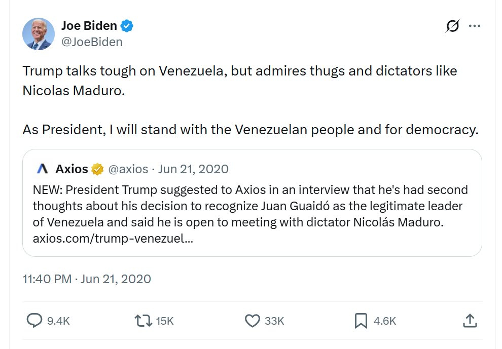 Meanwhile, here is presidential candidate Joe Biden castigating the Trump administration in 2020 for not going after Maduro: